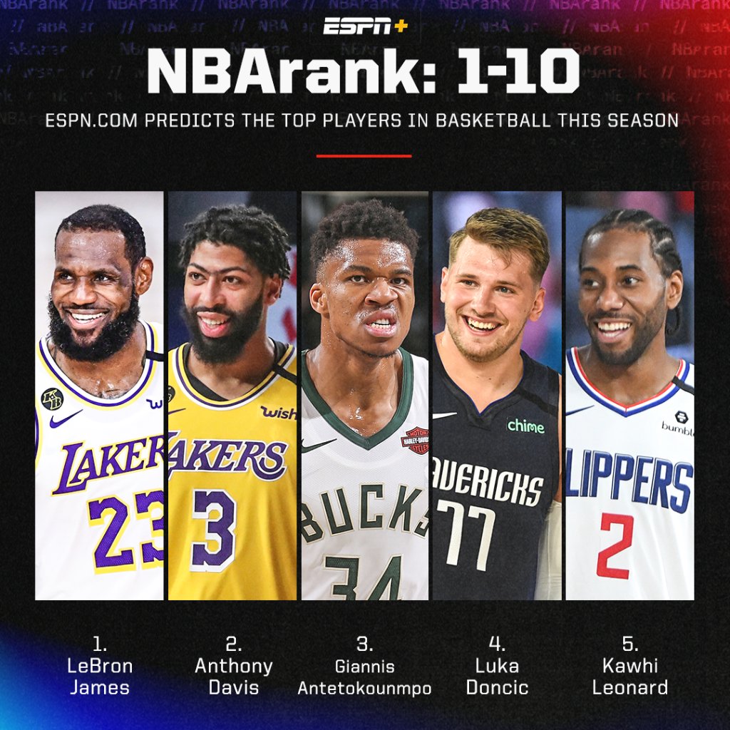 Πρώτος στην λίστα του ESPN βρίσκετε ο ΛεΜπρόν Τζέιμς ενω στο νούμερο 2 ο Άντονι Ντέιβις, με τον δικό μας Γιάννη Αντετοκούνμπο να συμπληρώνει την κορυφαία 3άδα του NBA. Την πεντάδα κλείνουν οι Λούκα Ντόντσιτς και Καουάι Λέοναρντ, ενώ πιο κάτω βρίσκονται άλλοι σταρ του NBA όπως οι Ντουράντ, Λίλαρντ, Κάρι, Χάρντεν και Γιόκιτς.